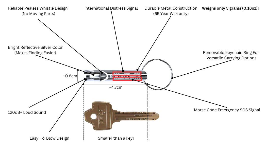 The Safety Whistle is ultra-compact and lightweight, making it easy to carry anywhere. Here are its dimensions and weight: