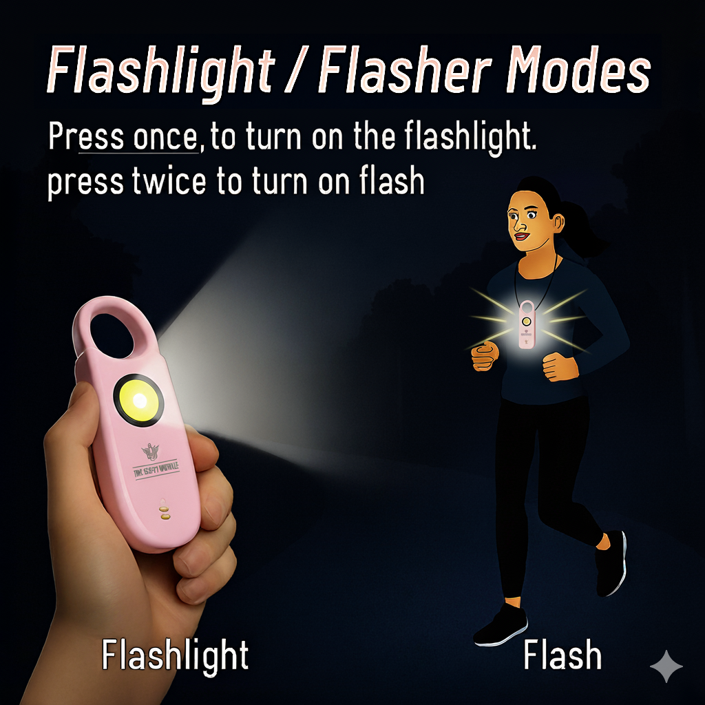 As loud as a jet takeoff! Small enough to hang on your neck! Doubles as a flashlight, flasher for night visibility and door/window alarm!